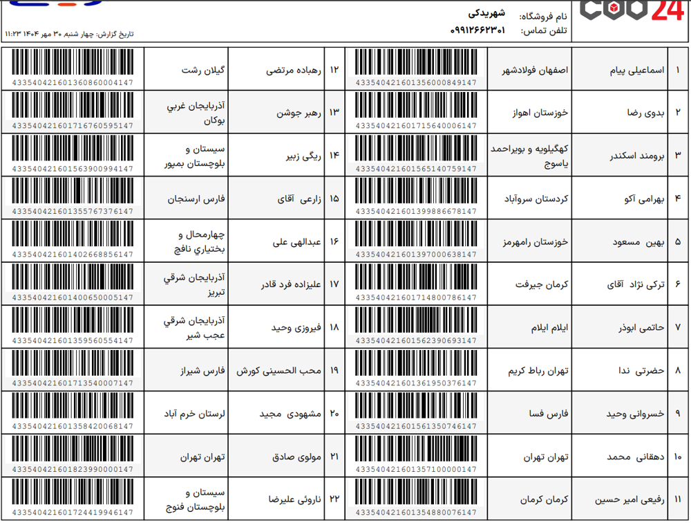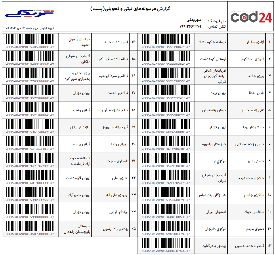 بارکدپستی 1404/07/23 ثبت سفارش جدید