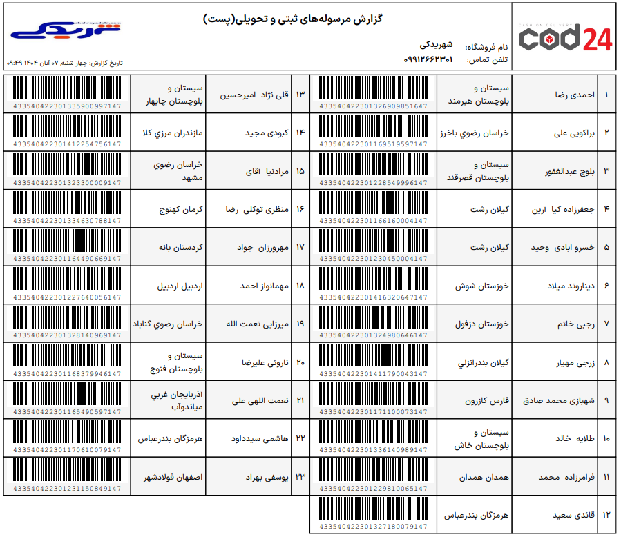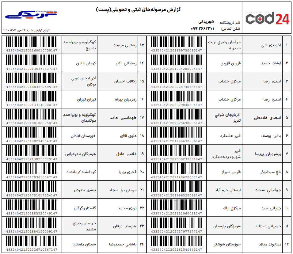 بارکدپستی 1404/2/24 ثبت سفارش جدید