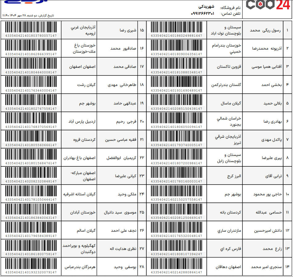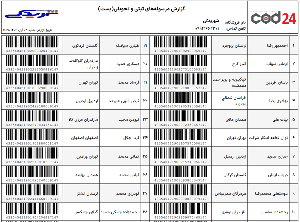 بارکدپستی 1404/1/28 ثبت سفارش جدید
