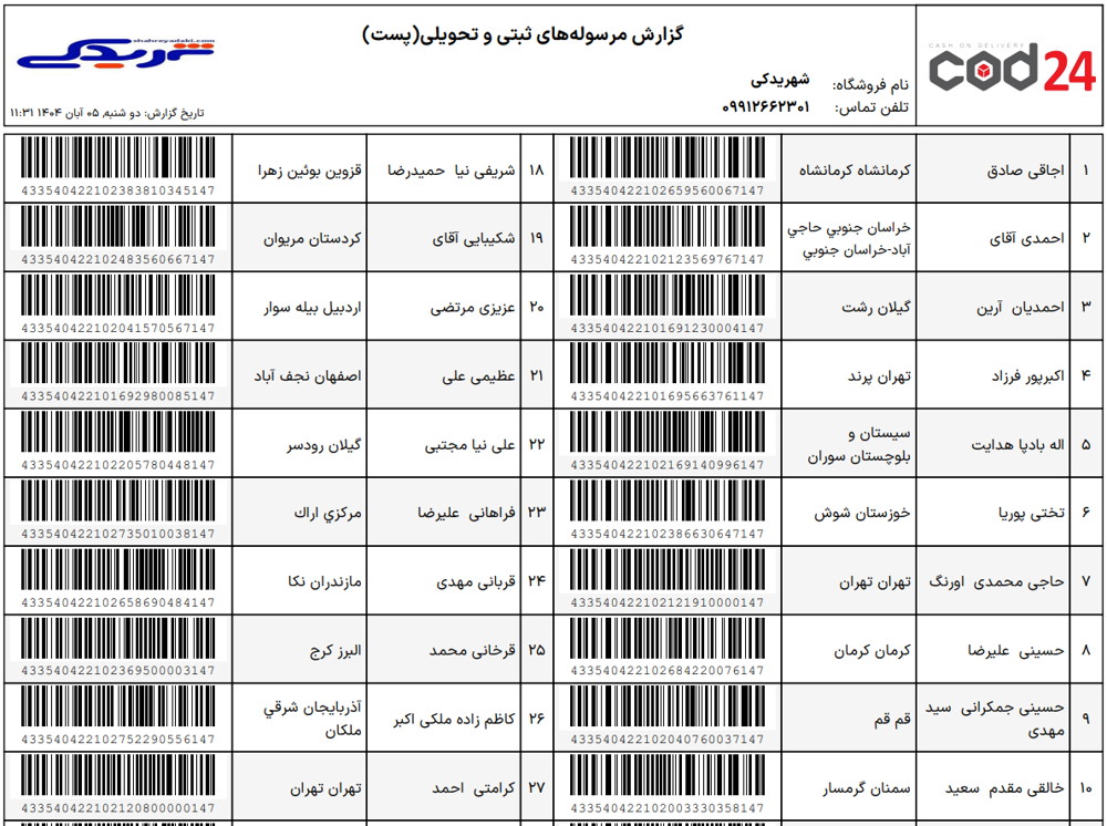 بارکدپستی 1404/08/05 ثبت سفارش جدید